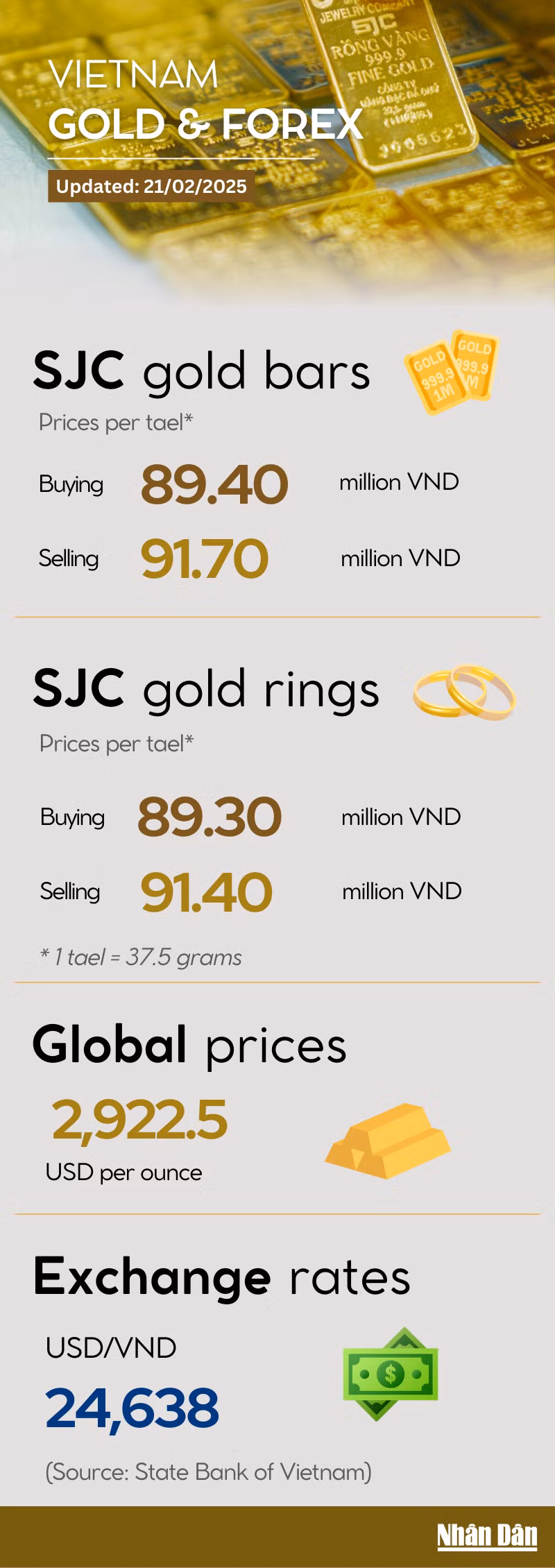 Global gold prices surged sharply on March 25, marking a second consecutive session of recovery following a recent downturn. In the domestic market, gold bar and ring prices also rebounded strongly in line with global trends, with selling prices ranging between 174 million VND and 175 million VND per tael.