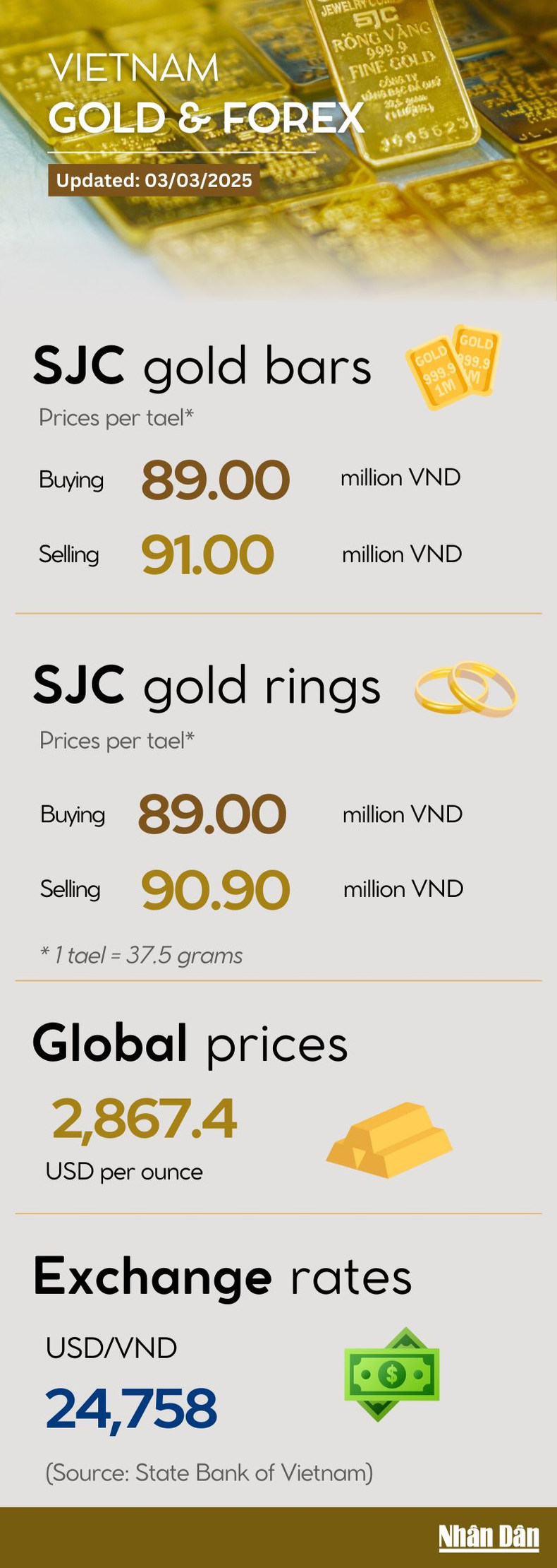 The world gold price went up to 2,867.4 USD per ounce on March 3 after a week of reduction. In the domestic market, the prices of SJC gold bars and gold rings rose following the world price, trading at 91 million VND and 90.9 million VND per tael, respectively.