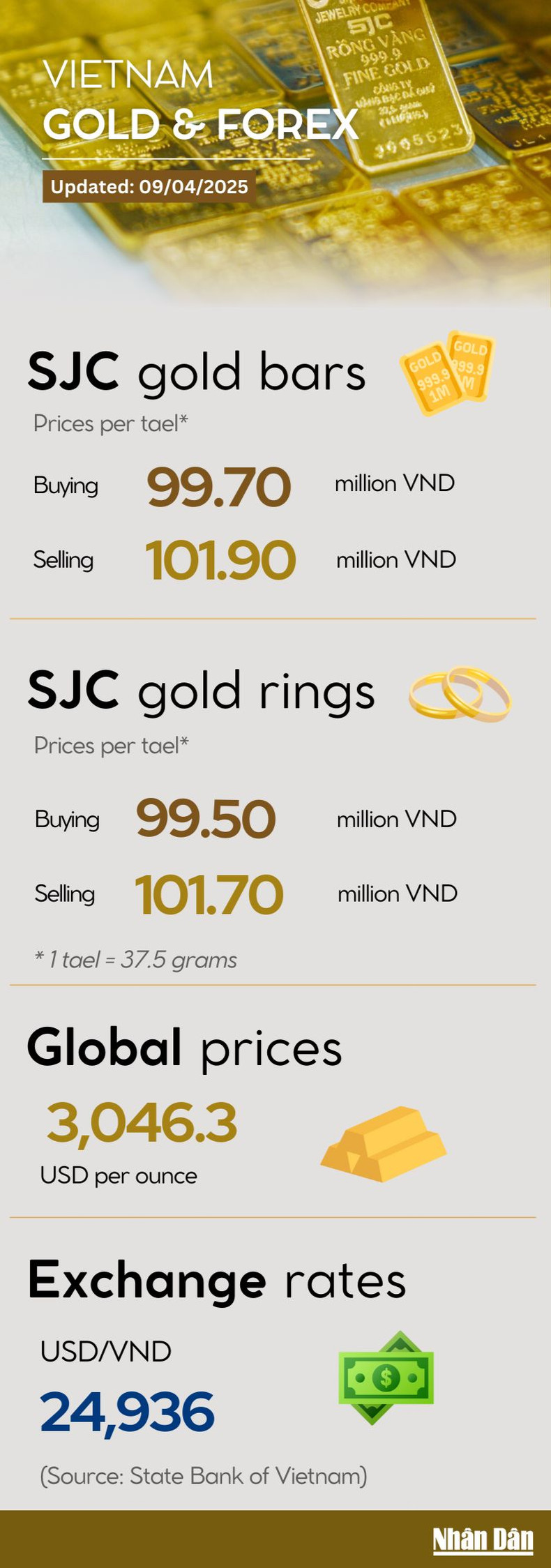 World gold prices on April 9 fluctuated continuously in the context of the US starting to impose new tariffs on trade partners, trading at 3,046.3 USD/ounce. Domestically, gold bars traded at 101.9 million VND/tael; SJC gold rings followed closely behind gold bars, trading at 101.7 million VND/tael.