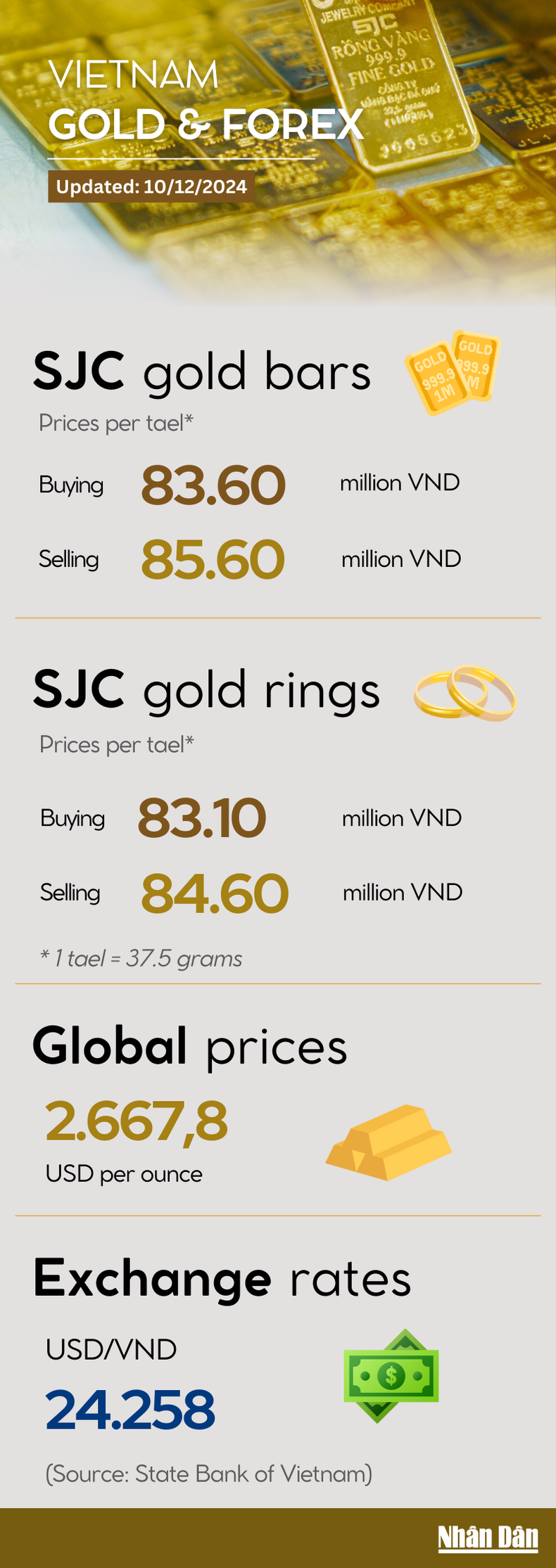 World gold prices on December 10 continued to increase strongly as China continued to buy this metal after a 6-month hiatus, trading at 2,667.8 USD/ounce. Domestically, gold prices skyrocketed. SJC gold bars were listed at 85.6 million VND/tael; gold rings at 84.6 million VND/tael.