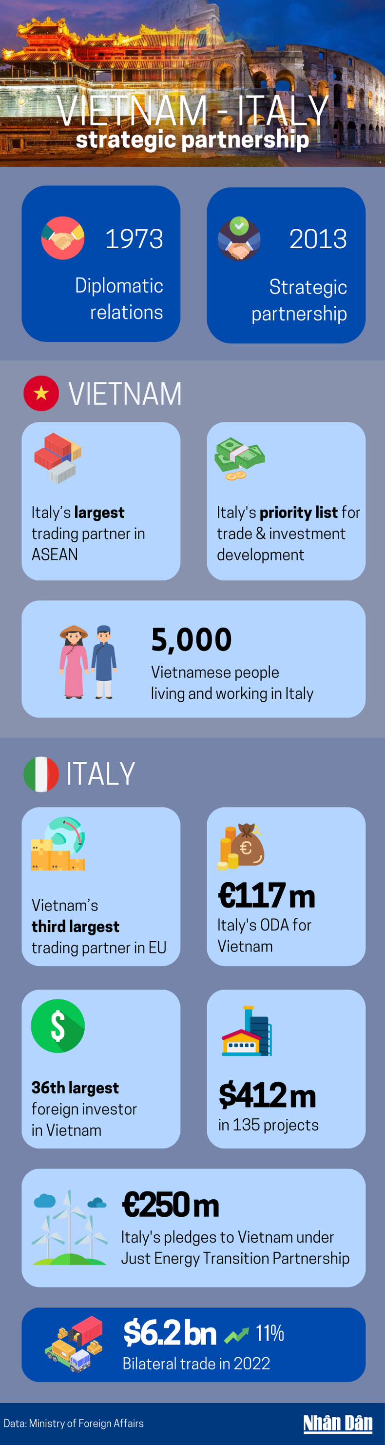 Vietnam and Italy formally established diplomatic relations in 1973. Since upgrading their ties to a strategic partnership in January 2013, the two countries have actively promoted substantive and effective cooperation across all fields: politics, diplomacy, the economy, science, education, defence-security, environmental protection and cooperation between localities.