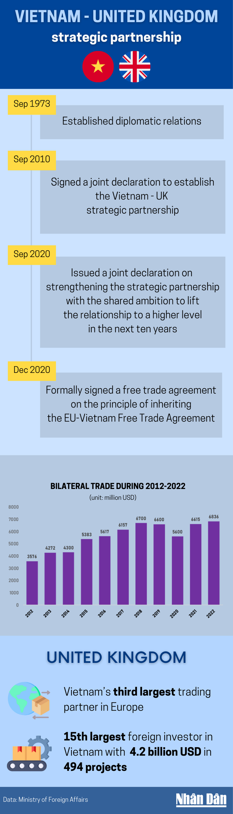 Vietnam and the United Kingdom established diplomatic relations in 1973. The two countries have enjoyed effective cooperation, in which economic and trade cooperation is a bright spot.