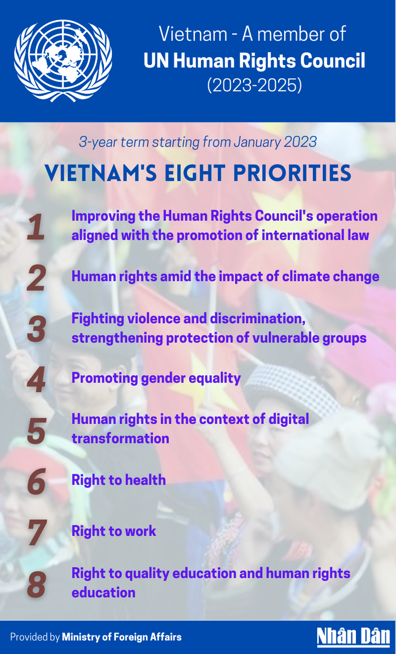During its tenure as a member of the United Nations Human Rights Council (2023-2025), Vietnam is focused on promoting eight main priorities.