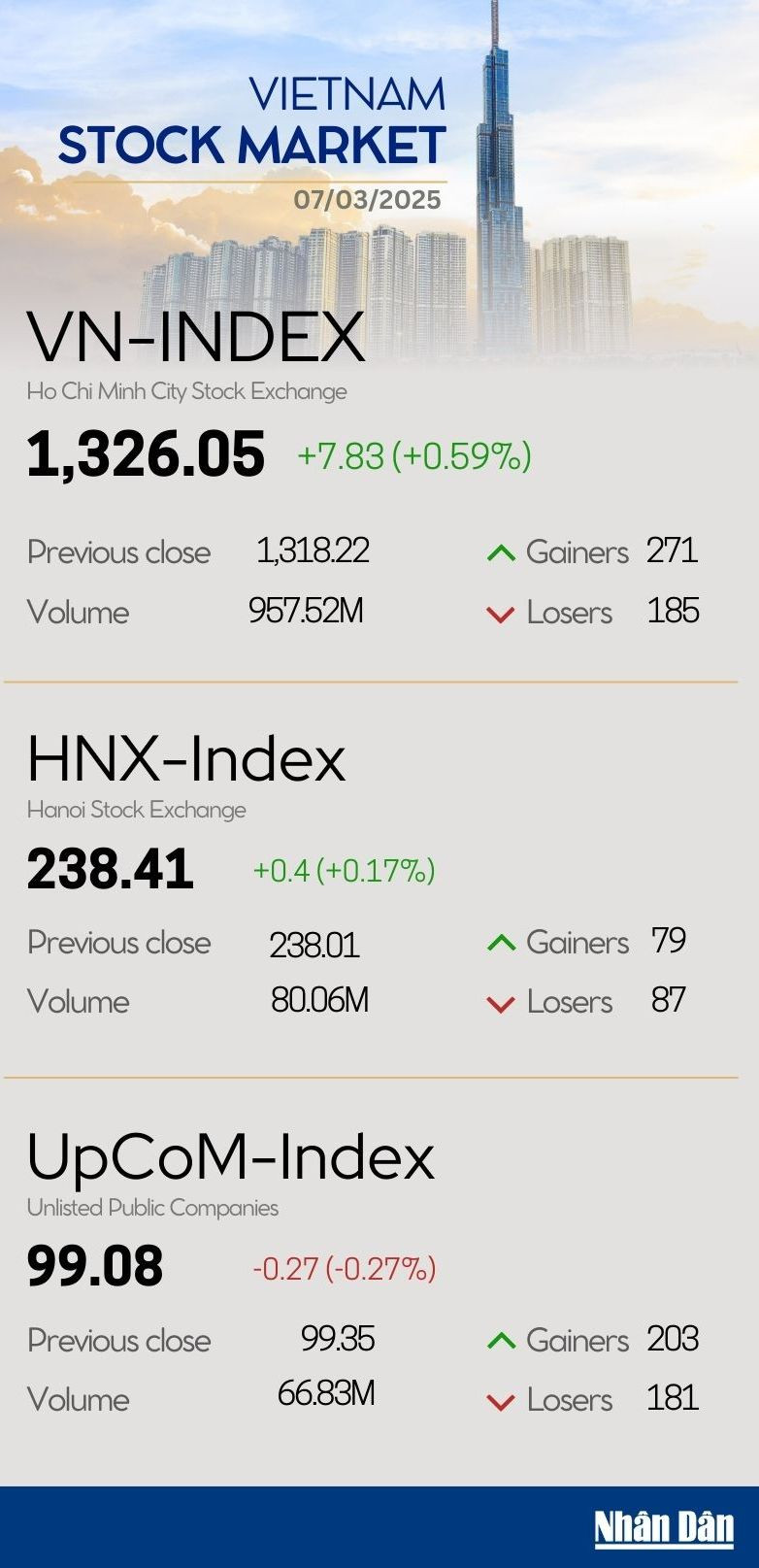 Vietnam's benchmark VN-Index on Friday rose 0.59% to 1,326.05 points, its highest since May 2022. The index closed 7.83 points higher after gaining 13.51 points in the previous session.