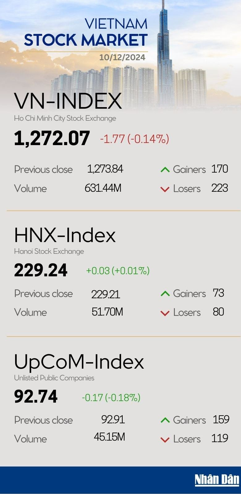 Vietnam's benchmark VN-Index fell 0.14% to 1,272.07 points on December 10 after three sessions in the green. The index closed 1.77 points lower after gaining 3.70 points in the previous session.