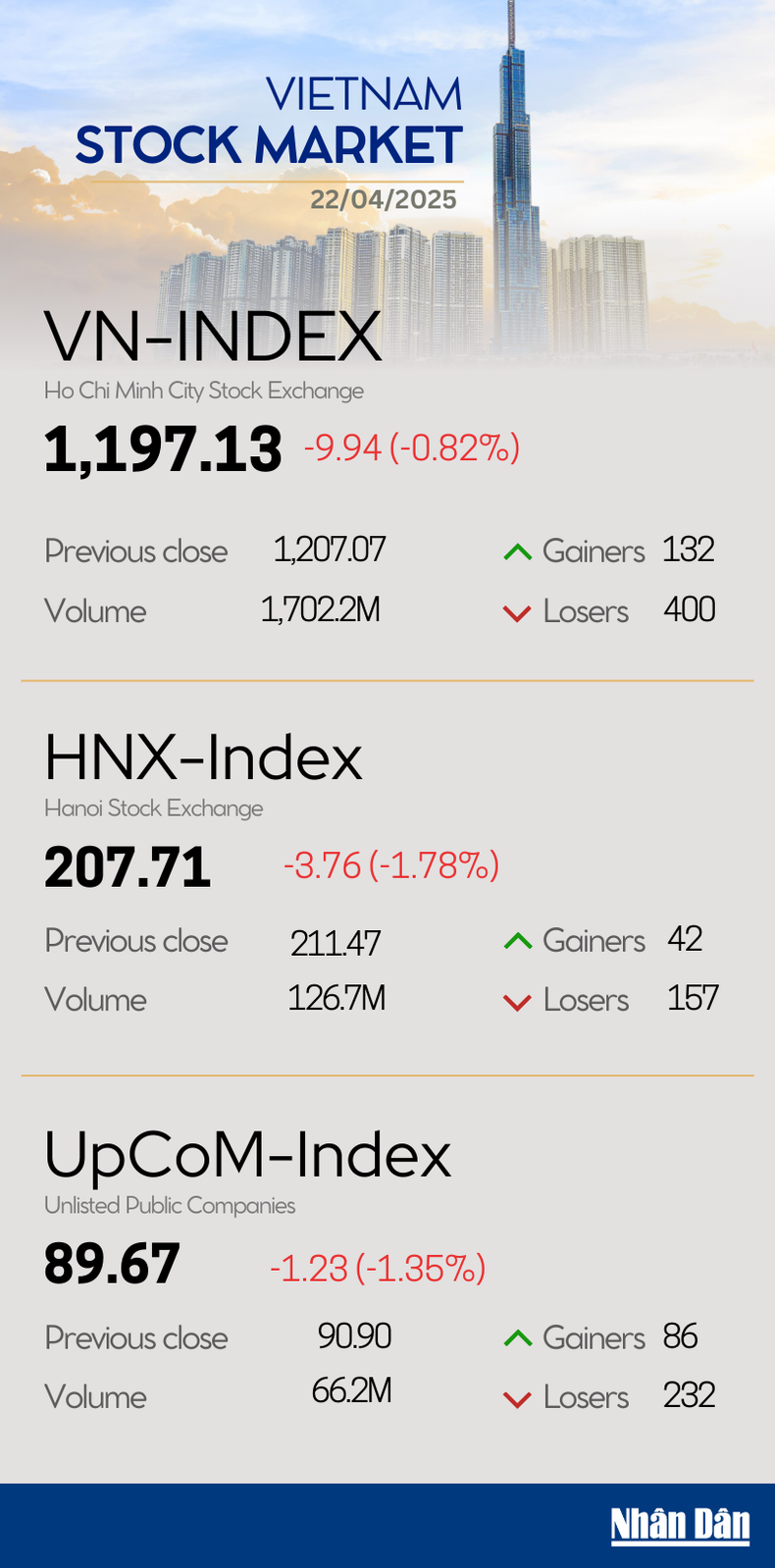 Vietnam's benchmark VN-Index fell by a further 0.82% to 1,197.13 points on April 22.