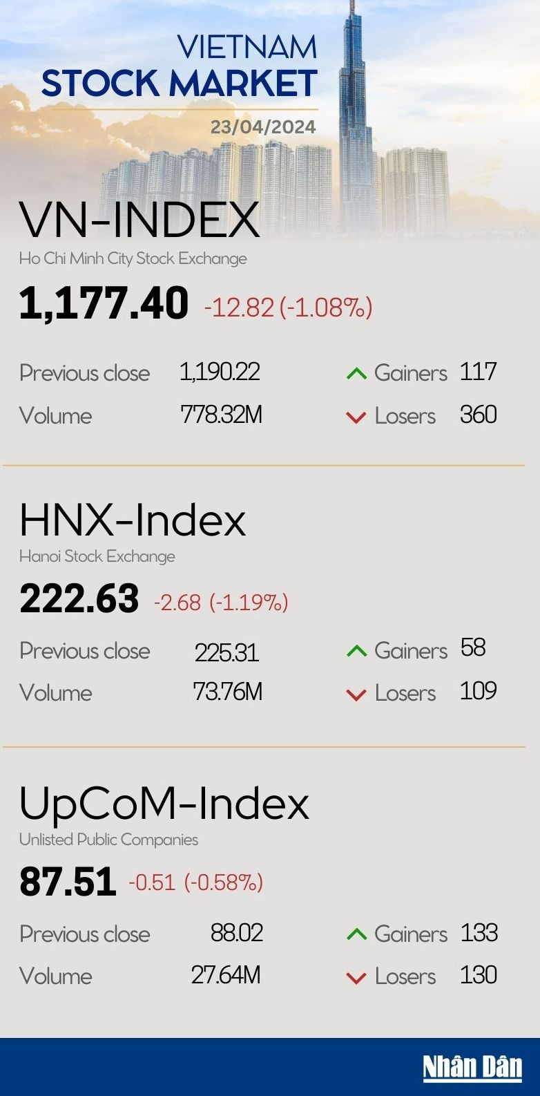 Vietnam's benchmark VN-Index fell 1.08% to 1,177.40 points on April 23.