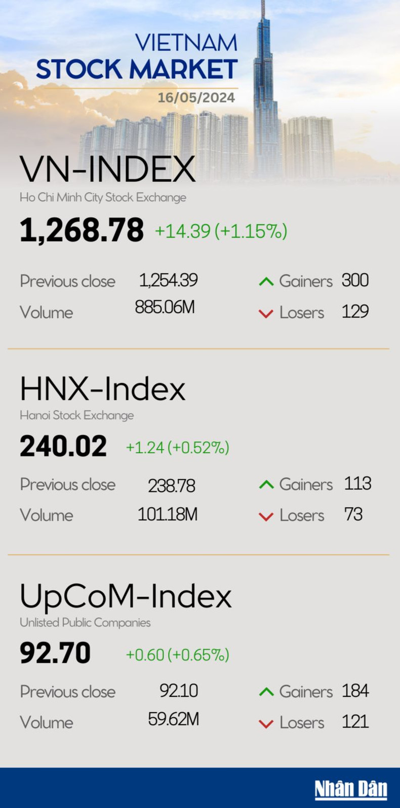 Vietnam's benchmark VN-Index rose 1.15% to 1,268.78 points on May 16.