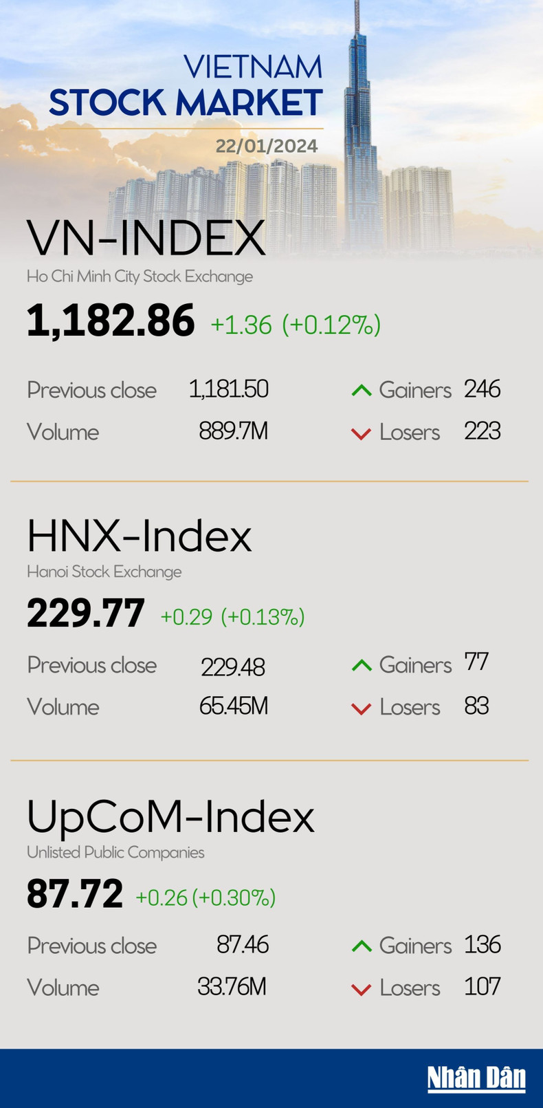 Vietnam's benchmark VN-Index rose 0.12% to 1,182.86 points on January 22, highest since September 22.
