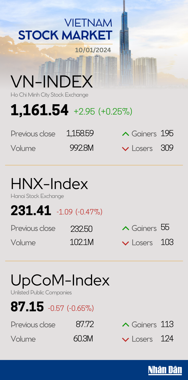 Vietnam's benchmark VN-Index rose 0.25% to 1,161.54 on January 10.