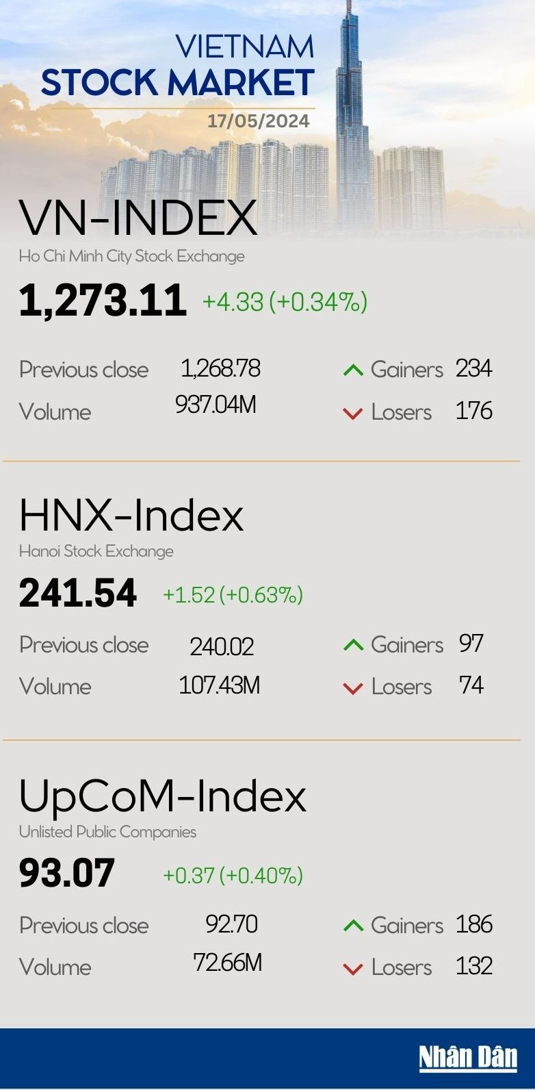 Vietnam's benchmark VN-Index rose 0.34% to 1,273.11 points on May 17 in its fourth consecutive gaining session.