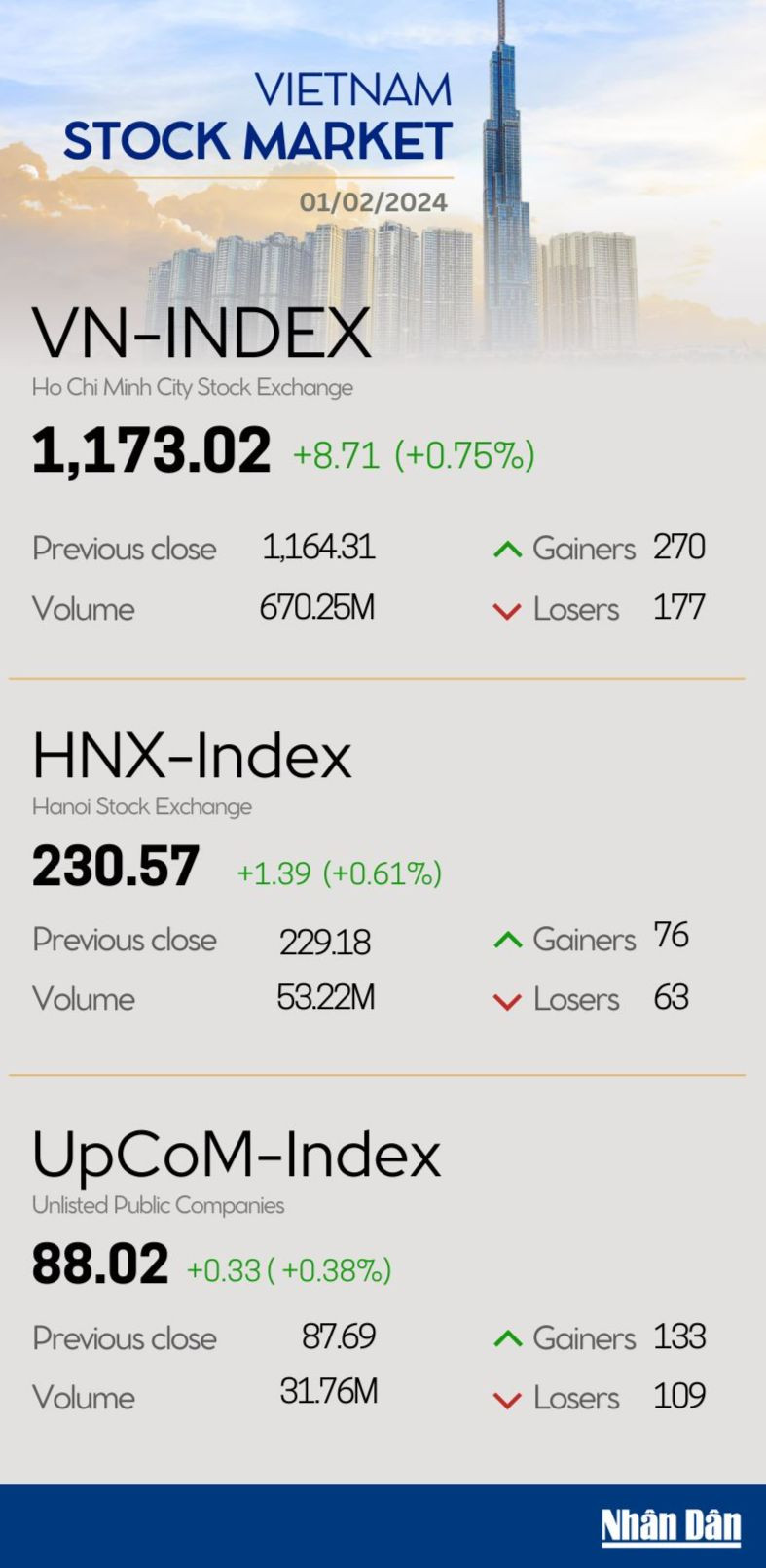 Vietnam's benchmark VN-Index increased 0.75% to 1,173.02 on February 1.