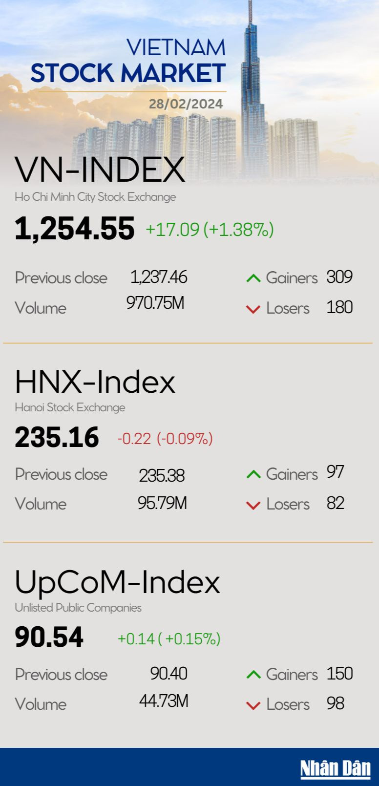 Vietnam's benchmark VN-Index rose 1.38% to 1,254.55 points on February 28.