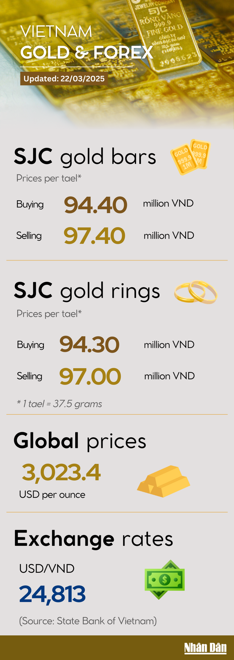 World gold prices on March 22 continued to plummet due to the strengthening of the USD and profit-taking pressure from investors, trading at 3,023.4 USD/ounce. Domestically, the price of SJC gold bars and gold rings decreased by another 300,000 VND per tael, trading at 97.4 million VND/tael and 97 million VND/tael, respectively; Doji gold rings fell to 98.2 million VND/tael.