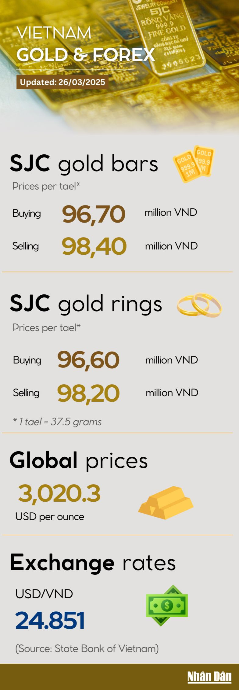World gold price increased slightly on March 26, trading at 3,020.3 USD/ounce. Domestically, the prices of SJC gold bars and gold rings traded at 98.4 million VND/tael and 98.2 million VND/tael, respectively.