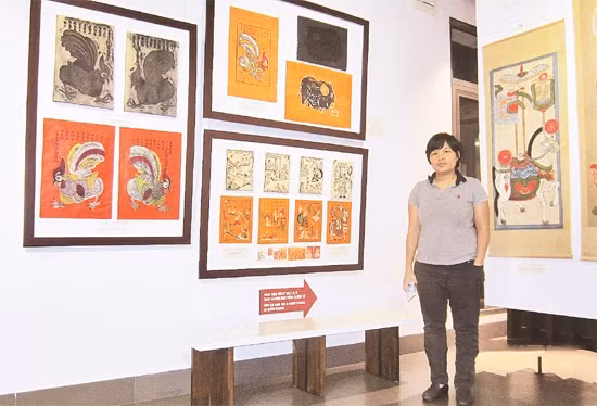 Arts collector Nguyen Thi Thu Hoa and reproductions of Kim Hoang folk paintings.