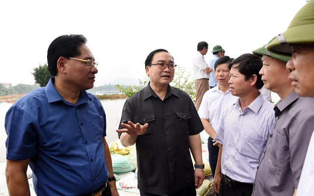 Politburo member and Secretary of Hanoi municipal Party Committee Hoang Trung Hai (C) visits locals who suffered from flood in Hanoi’s Chuong My district on August 4. More than 3,500 local households in the three communes of Nam Phuong Tien, Hoang Van Thu and Tan Tien are submerged in depths of 0.5-1.5m, forcing over 6,000 people to be evacuated.