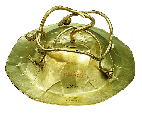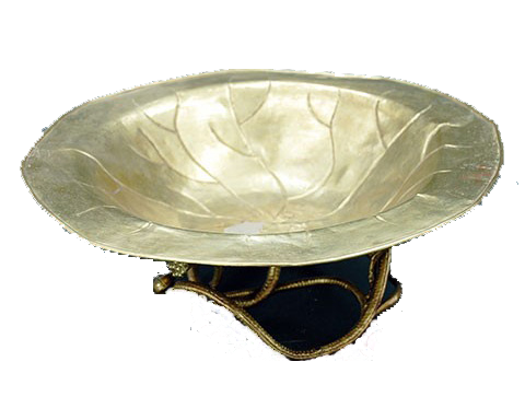 A washing basin was made in gold and in the shape of a lotus leaf. Its leg was designed as the lotus stem. It is 11,5cm height, 29,9cm diameter and 760gr weight.