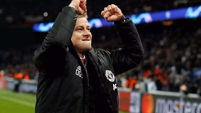 Manchester United interim manager Ole Gunnar Solskjaer celebrates after the match. (Reuters)
