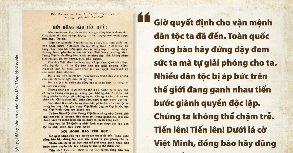 In his letter, he informed the people that Japan had surrendered. He highlighted the growing strength of the Viet Minh Front; and announced the establishment of the Viet Nam National Liberation Committee, elected by the “Congress of People’s Representatives”. He described it as “a major step forward in our nation’s struggle for liberation over nearly a century.”