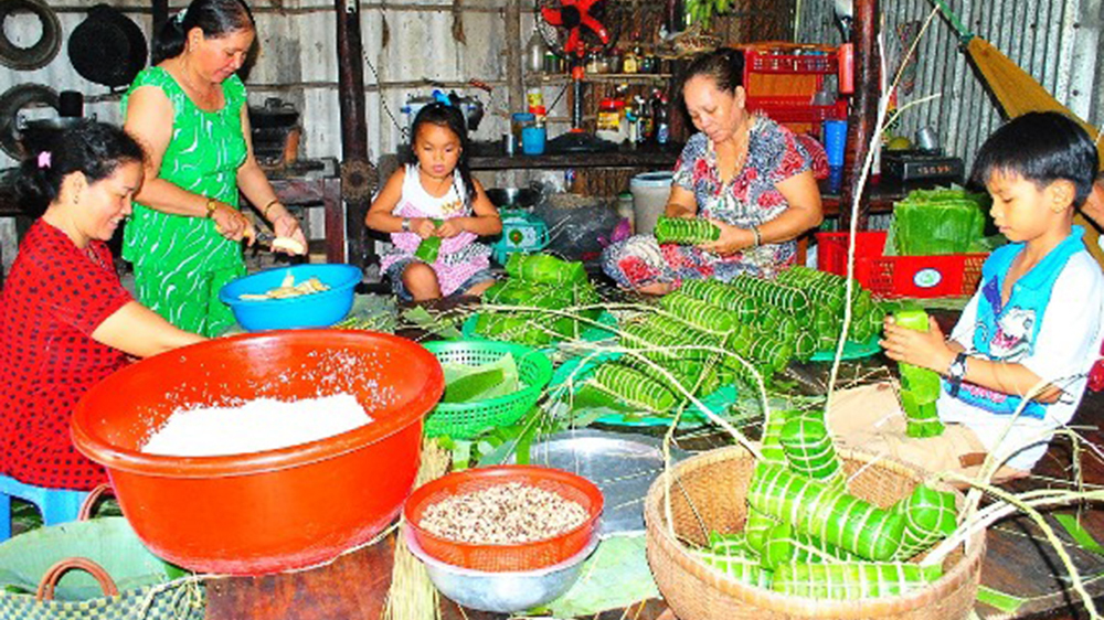 To prepare for this important event, the Khmer people clean and decorate their homes and furniture, buy new clothes and make traditional cakes. Khmer women often make different kinds of cakes, including banh tet (sticky rice cake with pork and green bean filling), banh it (sticky rice cake with coconut and green bean filling).