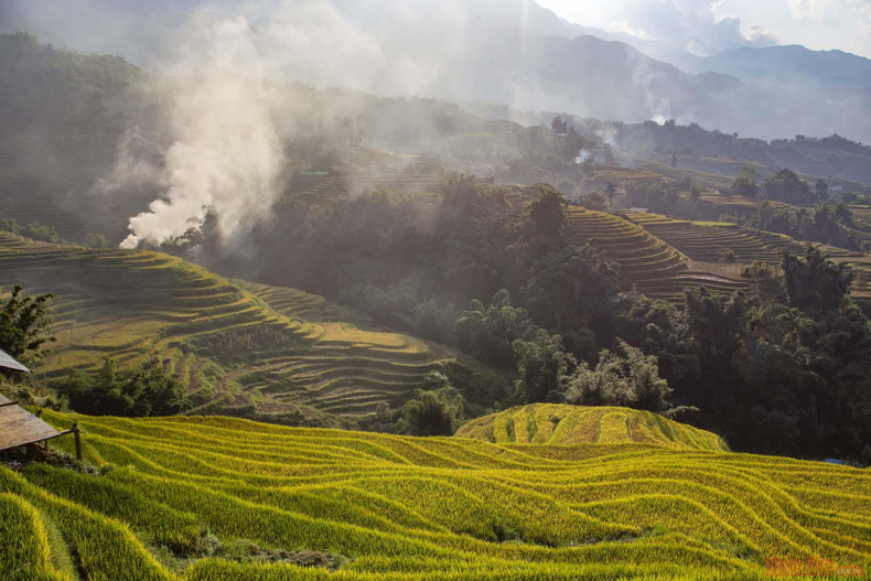 In addition to the bustle atmosphere during the harvesting days, visitors should not miss the beautiful moment of sunset in the locality. The evening clouds drop shadows into the valley, creating scenery of paradise.