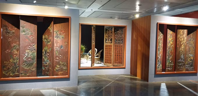 However, how to create an artwork inspired from the object is a long way, which took him almost one year to finish. Each step in the making of the door set was done manually with its decoration patterns coming from popular images in daily life, including chickens, storks, rice grains, and pineapples.