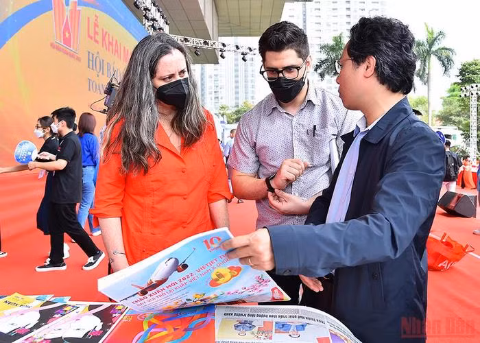 Foreign readers visit the pavilion of Nhan Dan Newspaper.