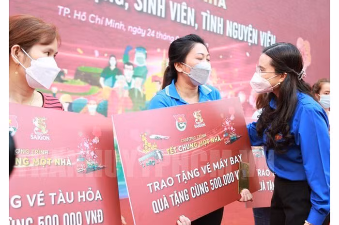Representatives from the Ho Chi Minh Communist Youth Union presentes bus, train and air tickets to students and workers. (Photo: NDO)
