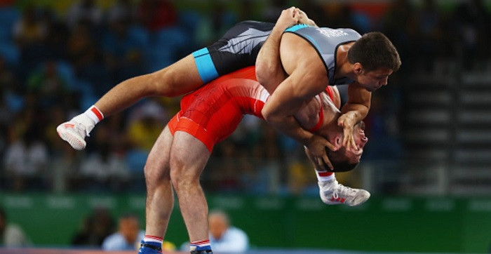 Davit Chakvetadze of Russia and Denis Kudla of Germany compete in the Men's Greco-Roman 85 kg on Day 10 of the Rio 2016 Olympic Games at Carioca Arena 2 in Rio de Janeiro, Brazil on August 15, 2016. (Photo: Getty Images)