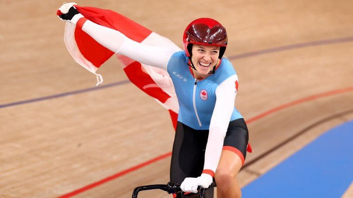 Tokyo 2020 Olympics - Cycling - Track - Women's Sprint - Gold Final - Izu Velodrome, Shizuoka, Japan - August 8, 2021. Kelsey Mitchell of Canada celebrates with a Canadian national flag after winning gold. (Photo: Reuters)