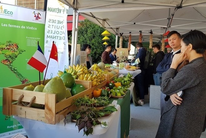 A booth showing farm produce from Vietnam at the Rungis International Market in Paris in 2018. (Photo: VNA)