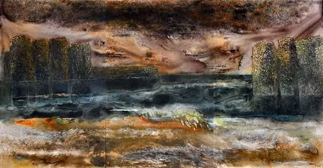 In his paintings, Thang utilises horizontal composition and warm colours to present the movements of water flows, waves, clouds, and wild nature in an abstract style.