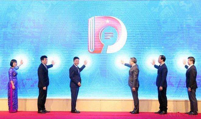 Deputy Prime Minister Le Thanh Long (third, left), Minister of Justice Nguyen Hai Ninh and other delegates perform the ceremony to launch the phapdien.moj.gov.vn, a tool to look up and search for useful legal regulations for people and businesses in November 5, 2024. (Photo: VNA)