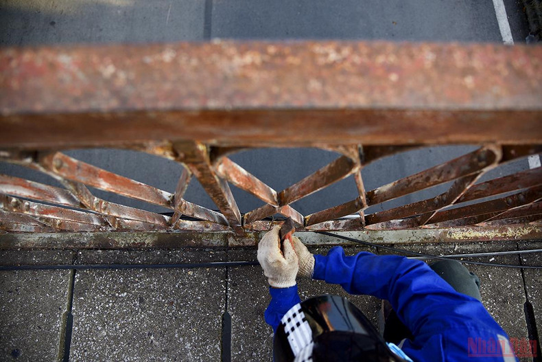 The unsafe positions of the two rows of railings on the bridge are carefully reinforced, to ensure the longevity of the historic bridge.