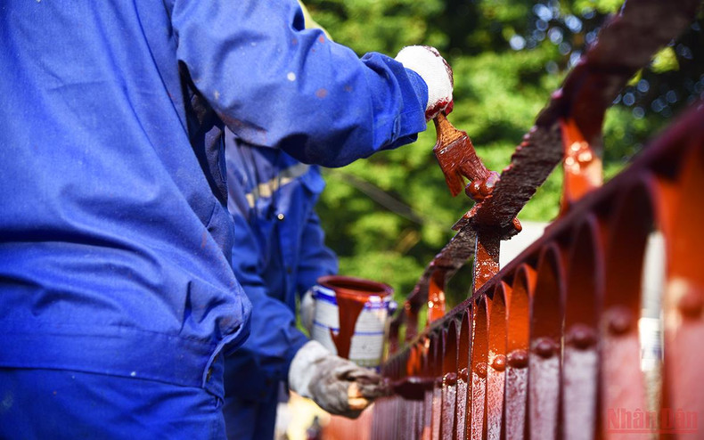 40 workers of the construction unit were divided into four teams to clean, paint anti-rust, and then paint the second layer of two rows of railings on the bridge.