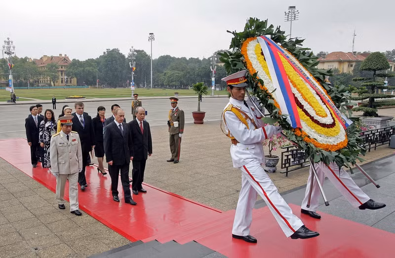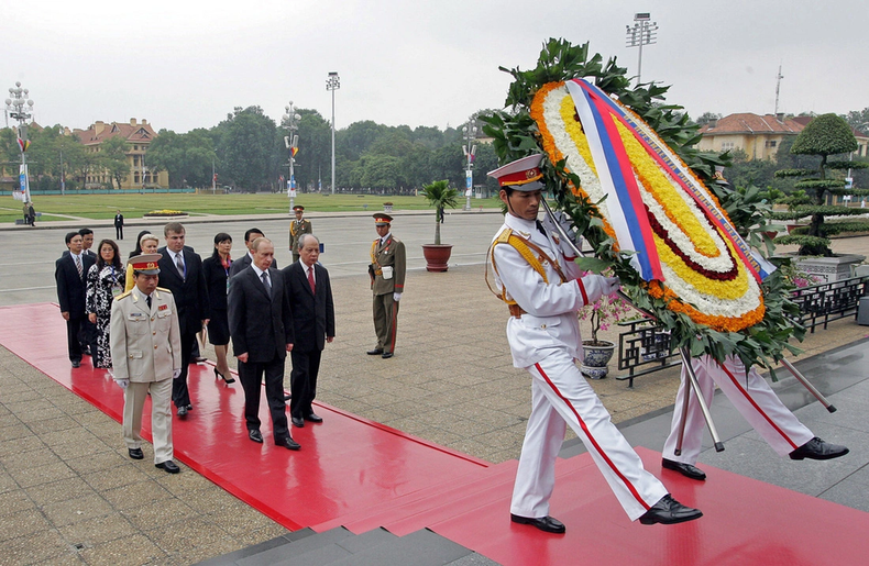 The Russian President pays tribute to President Ho Chi Minh at his mausoleum in Hanoi. (Photo: AFP)