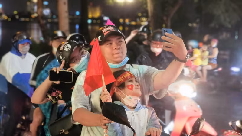 People poured into the streets with the national flag in their hands to celebrate the victory of the Vietnam U23 team. (Photo: Duy Linh)