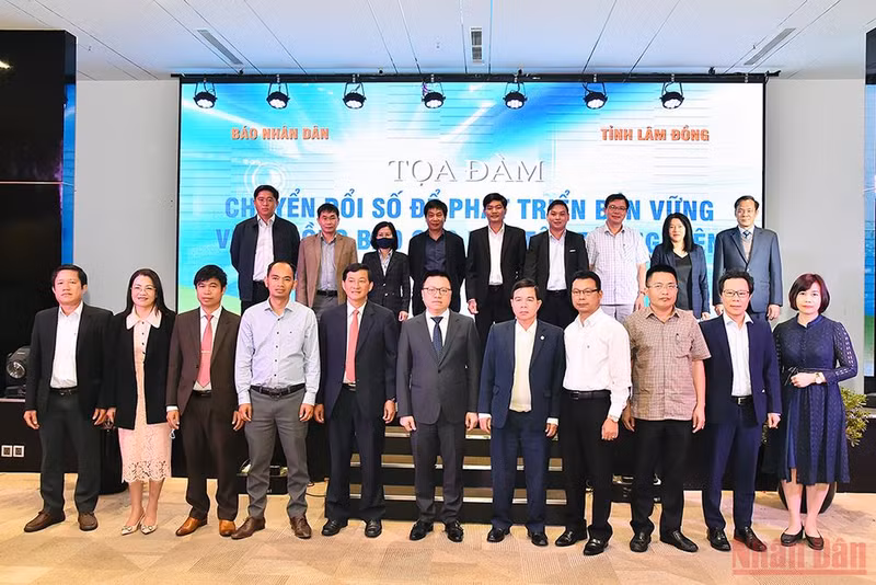 Leaders of Nhan Dan Newspaper, Lam Dong province and Dak Nong province and delegates at the seminar pose for a group photo. (Photo: Thuy Nguyen)