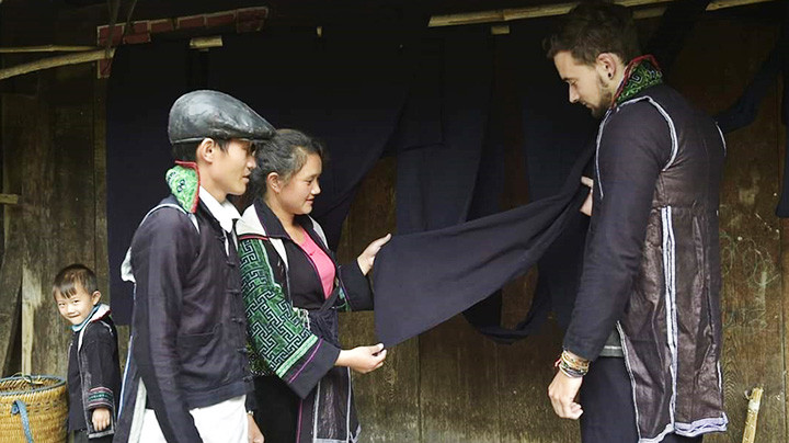 Seo My Ty villagers introduce a foreign tourist to their traditional brocade products.