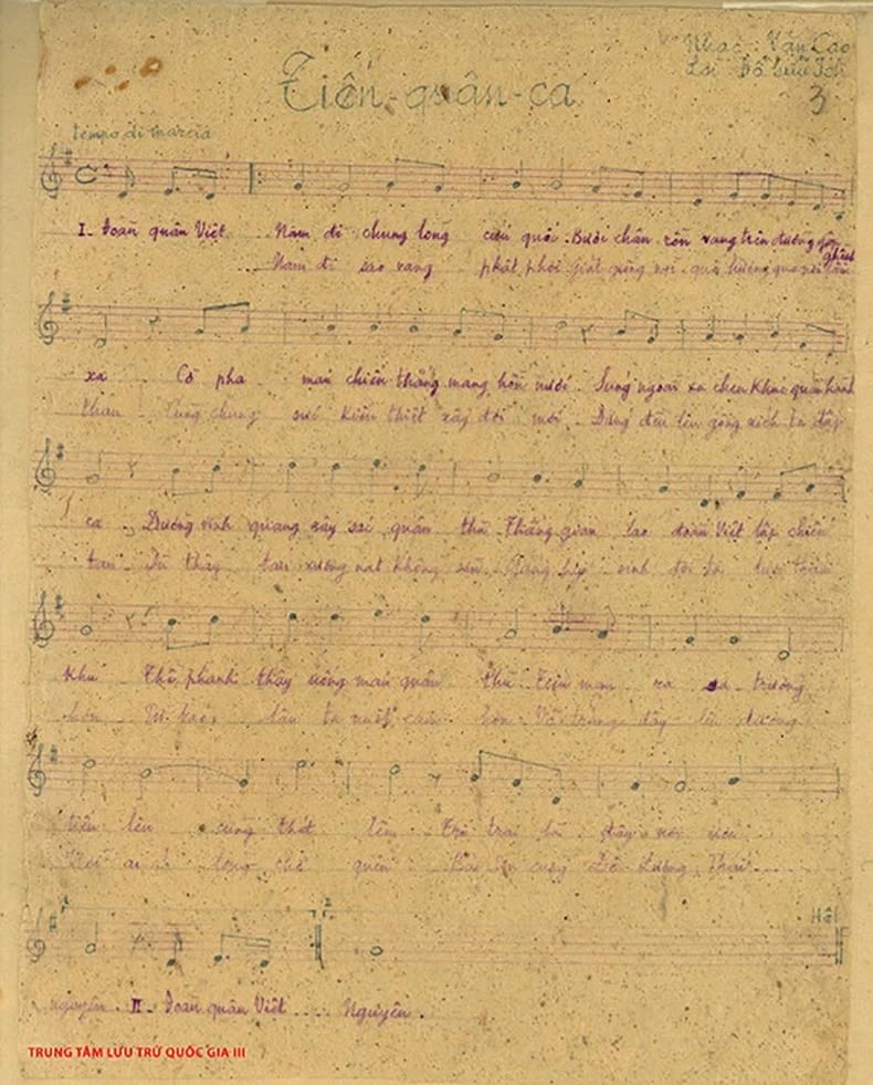 Manuscript of the song ‘Tien Quan Ca’ (The Song of the Marching Troops) by musician Van Cao. (Photo: National Archives Center III, Prime Minister's Office, file 590, page 3)