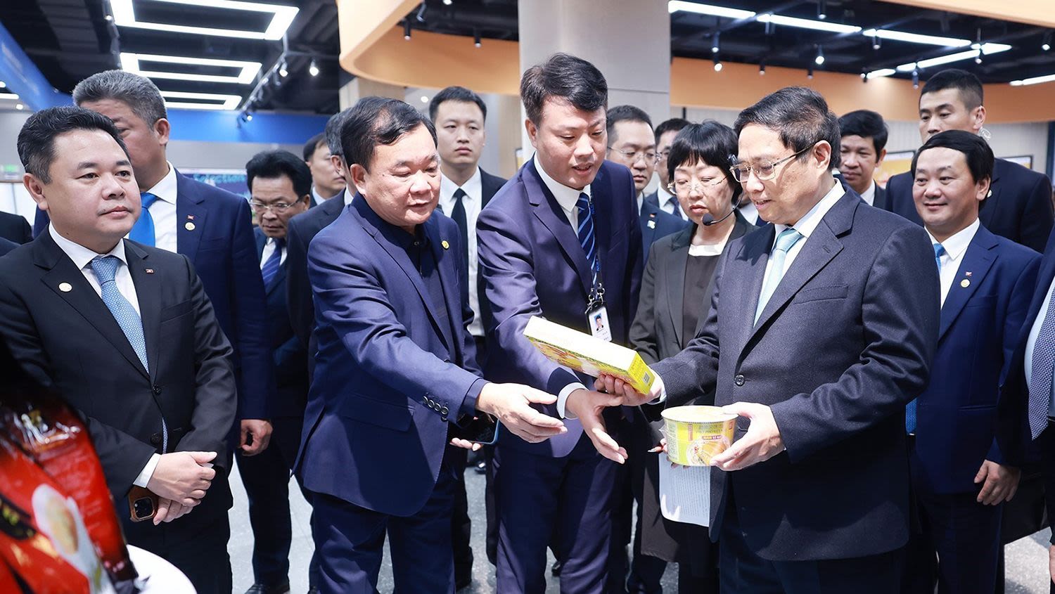 Vietnamese Prime Minister Pham Minh Chinh visits the display area for Vietnamese products at the Logistics Centre in Chongqing City, China. (Photo: VNA)