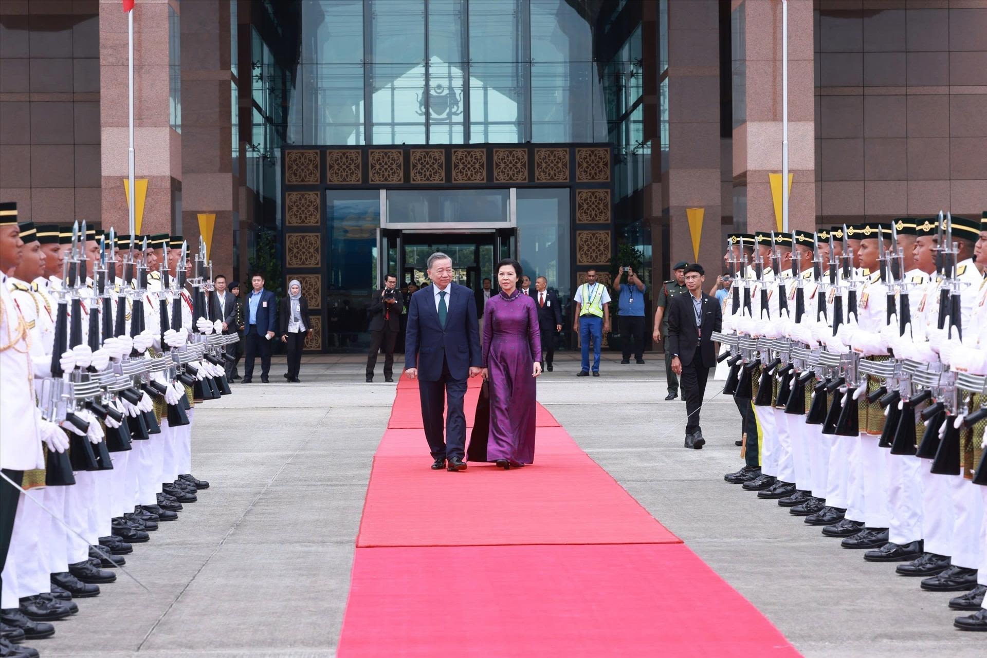 Malaysian Prime Minister Anwar Ibrahim hosts a solemn welcome ceremony for Party General Secretary To Lam on his official visit to Malaysia. (Photo: VNA)