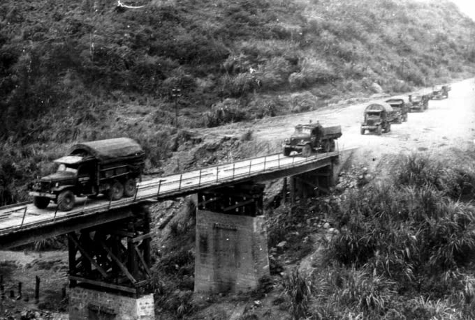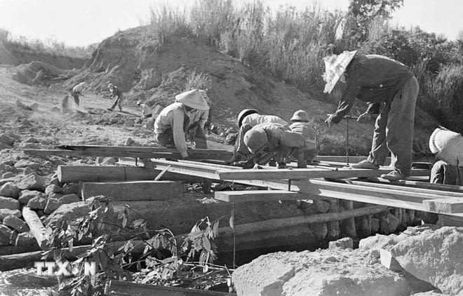 Despite the frantic bombing by American aircraft, the engineers of Cau D, Quang Binh, still stuck to the road day and night, building bridges for vehicles to reach the front line, ensuring the traffic artery between the rear and the front line, August 1968. (Photo: Chi Thanh/VNA)