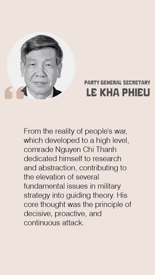 From the reality of people's war, which developed to a high level, comrade Nguyen Chi Thanh dedicated himself to research and abstraction, contributing to the elevation of several fundamental issues in military strategy into guiding theory. His core thought was the principle of decisive, proactive, and continuous attack.