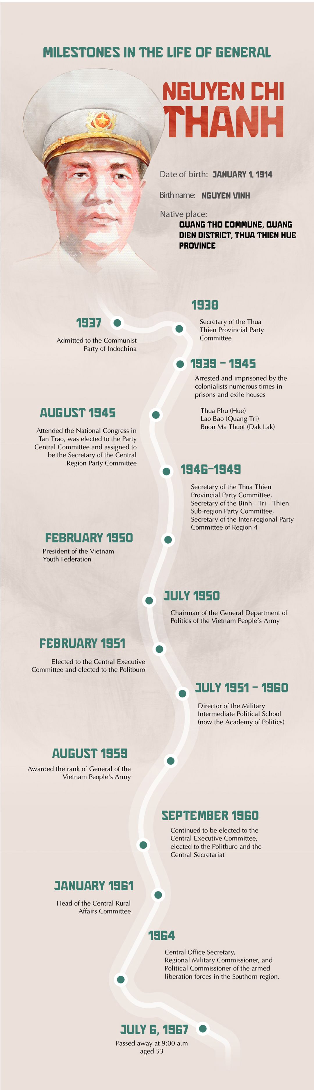 During the more than 30 years of his revolutionary career, General Nguyen Chi Thanh was present in the most difficult and challenging places. He dedicated his life to the ideals of the Party and served the cause of national liberation. He demonstrated the qualities of a talented and strategic general of the Vietnam People's Army: an exemplary leader with great resolve and courage, and a shining example of a communist. The valuable legacies of Nguyen Chi Thanh, which contain profound theoretical and practical values, continue to be studied and creatively applied in the decisive stage of the resistance war against the US as well as in the cause of building the army and strengthening national protection and defence in the new era.