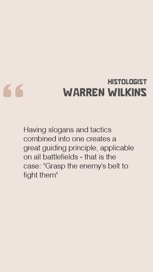 Having slogans and tactics combined into one creates a great guiding principle, applicable on all battlefields - that is the case: "Grasp the enemy's belt to fight them"