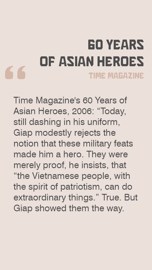 Time Magazine's 60 Years of Asian Heroes, 2006: “Today, still dashing in his uniform, Giap modestly rejects the notion that these military feats made him a hero. They were merely proof, he insists, that “the Vietnamese people, with the spirit of patriotism, can do extraordinary things.” True. But Giap showed them the way.