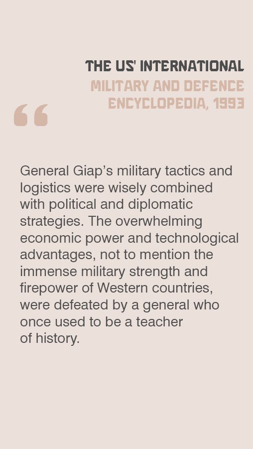 General Giap’s military tactics and logistics were wisely combined with political and diplomatic strategies. The overwhelming economic power and technological advantages, not to mention the immense military strength and firepower of Western countries, were defeated by a general who once used to be a teacher of history.