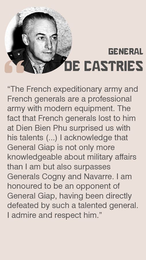 “The French expeditionary army and French generals are a professional army with modern equipment. The fact that French generals lost to him at Dien Bien Phu surprised us with his talents (...) I acknowledge that General Giap is not only more knowledgeable about military affairs than I am but also surpasses Generals Cogny and Navarre. I am honoured to be an opponent of General Giap, having been directly defeated by such a talented general. I admire and respect him.”